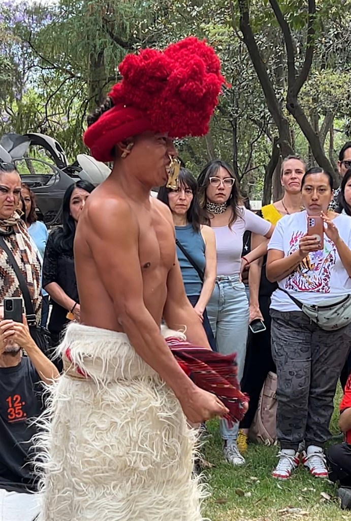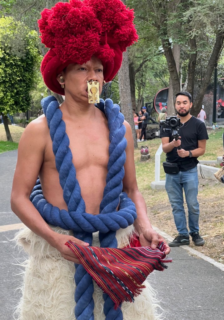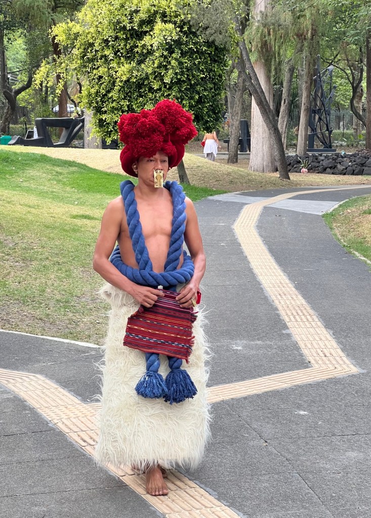 El performance de Lukas se programó a las 4:30 pm del jueves 4 de abril en los jardines del Museo de Arte Moderno. Las personas que llegamos con anticipación nos encontramos al artista deambulando lentamente entre aproximadamente 30 espectadores (más adelante, junto con otras personas que fueron llegando, calculo que llegamos a sumar alrededor de 60). De inmediato nos cautivó la poderosa imagen de una figura ataviada con vestimenta proveniente de la ancestralidad zapoteca: “Traigo conmigo las ropas de mis abuelas binni zaa´” me dijo Lukas posteriormente (en respuesta por correo electrónico a mis preguntas, 12 de mayo 2024). Los materiales orgánicos de los textiles usados en el tocado, la falda y demás accesorios ––con trama cromática de rojos, azules y blancos–– contrastaban radicalmente con una placa de metal dorado que Lukas portaba en su boca, sostenida por una nariguera que me hizo pensar en los hallazgos de la famosa Tumba 7 de Monte Albán. Al pasar junto a mí, noté que debajo de la placa tenía colocado en la boca un instrumento que separaba sus labios para exponer los dientes. Esto imposibilitaba que pudiera pronunciar palabra, pero a lo largo de la acción escuchamos frases pregrabadas con su propia voz, a través de las bocinas colocadas en diversos puntos del jardín.