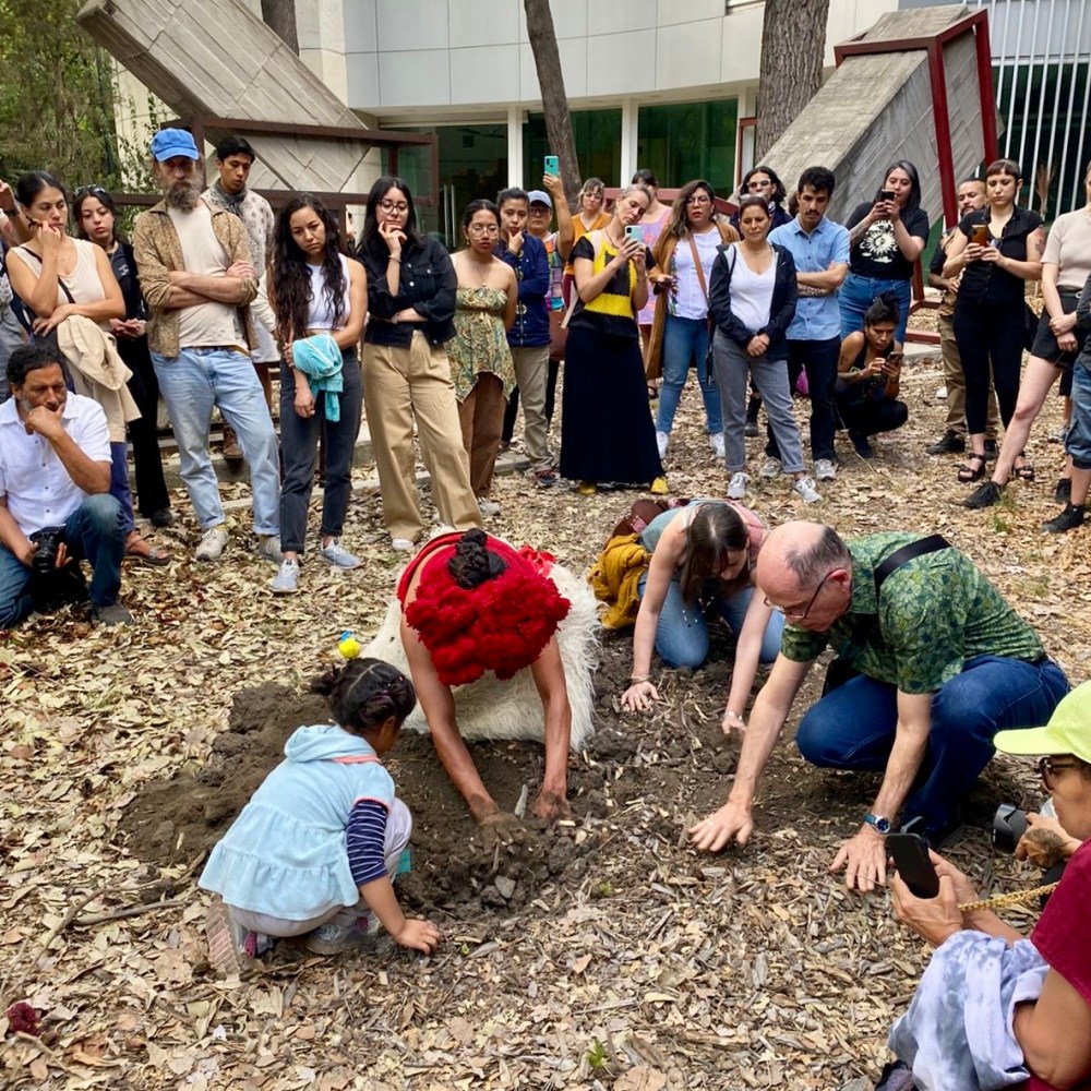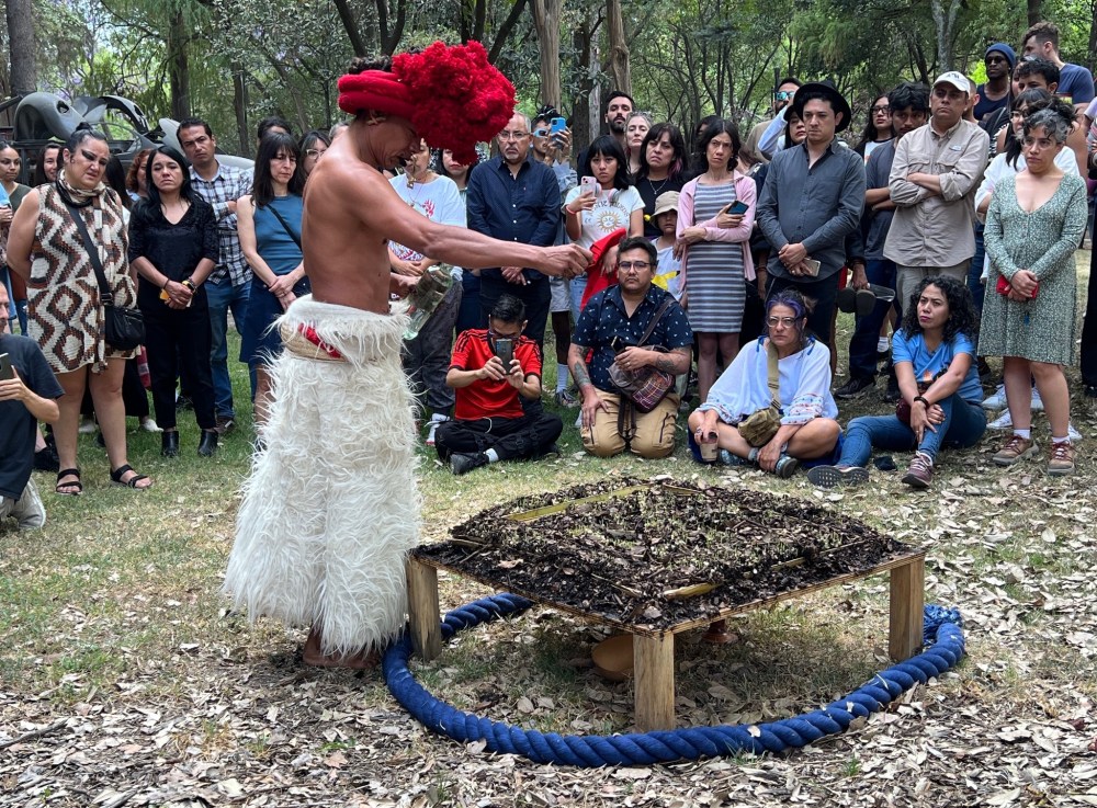 La acción política travestida de ritual puede servir como estrategia de camuflaje frente al poder, pero también logra que la insurrección sea performativa: un acto del habla y del gesto que transforma nuestra manera de ver las cosas. Según Lukas, realizar el performance en el Museo de Arte Moderno obedeció en parte a su interés por “poner en crisis el concepto de modernidad”, ya que “a la vuelta de 50 años, todo lo que se edifica en nombre de la modernidad ya es viejo, a diferencia de lo arcaico, lo autóctono, que en cuanto más tiempo pasa, […] parece que más vitalidad toma” (Avendaño, L., correo electrónico, 20 de mayo de 2024). De hecho, el artista sostuvo una tensa negociación con las autoridades del museo, que inicialmente prohibieron cualquier alteración al suelo de sus jardines, considerados “patrimonio nacional”. Finalmente, accedieron al entierro de las pencas, a condición de que al día siguiente fueran desenterradas para que no quedara rastro de la intervención. A esto, Lukas respondió con sarcasmo: “Sí, hagamos la exhumación con peritos de la FGR, de la forma en que exhumaron los huesos de mi hermano en una fosa clandestina” (Avendaño, Bedxe´guie´, p. 3).