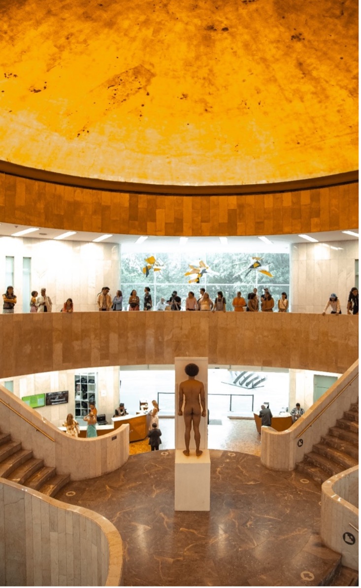 Lukas Avendaño, (me dice sobre la imagen de la cúpula ámbar del lobby central, en su conjugación con la imagen de Carlos Martiel, que sigue de pie sobre el pilar blanco, sólo con un panel cubriendo un cuarto de la imagen de su cuerpo desnudo): Es como la pupila dilatada, como la metáfora de la pupila dilatada para que entre la luz, porque todo es tiniebla.