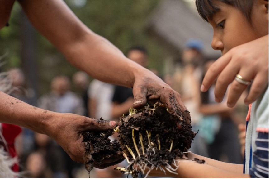 Foto del día anterior durante la performance. Lukas poniendo en manos de la niña un pedazo de milpa.