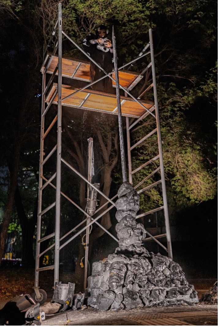 [Cae uno de los paneles blancos que custodia el Monumento III, el cuerpo de Carlos Martiel continúa estático, firme, impasible.]