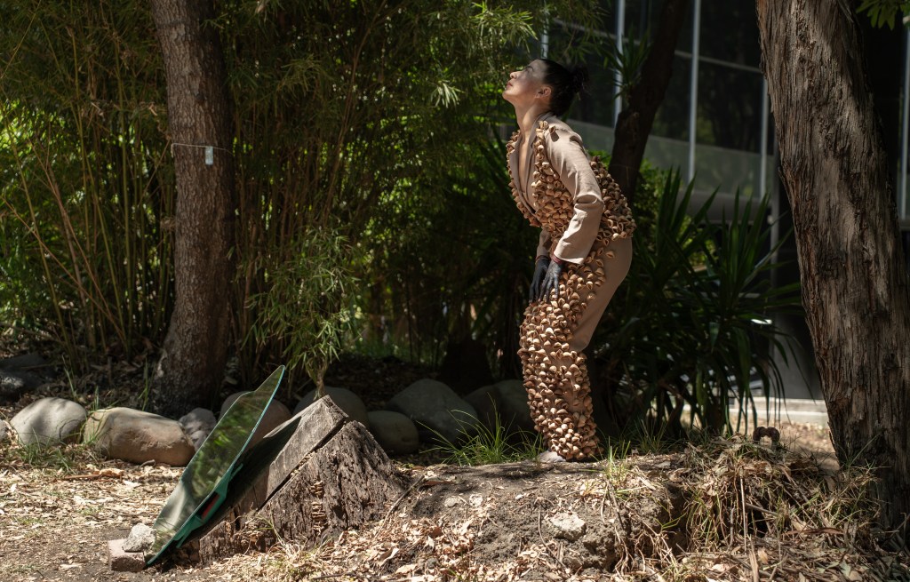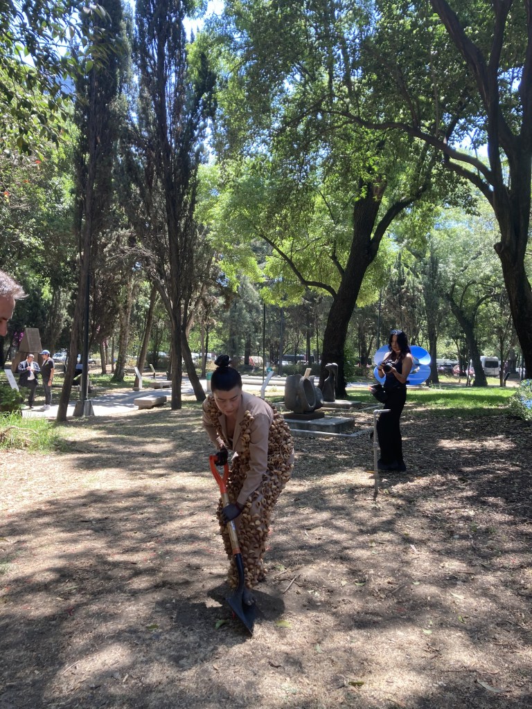En el interior del Museo, bajo la majestuosa cúpula que simula al sol, hecha de poliéster y fibra de vidrio -ambas materias fósiles- la performance actúa como velo apolíneo para protegernos de la mortal visión de la tragedia que se cierne sobre nuestras cabezas, la tragedia de la extinción. Es entonces cuando Martha comienza a agitar su cuerpo despertando el sonido de las semillas que lleva atadas como una segunda piel. El sonido que emerge inunda de inmediato el dorado espacio convirtiéndose en materia sólida que hace vibrar las membranas de todos los cuerpos presentes.