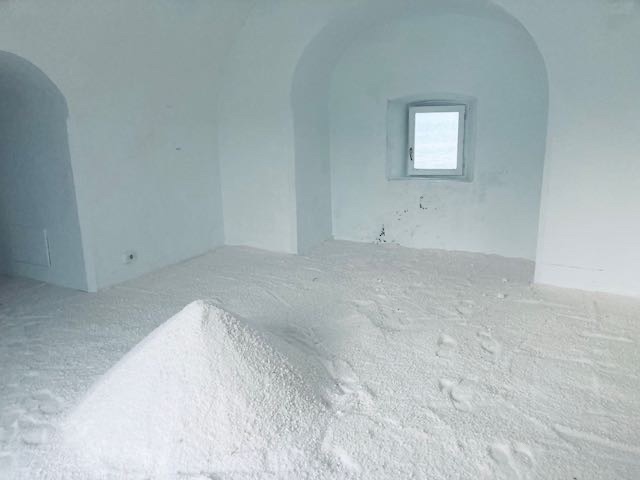 La instalación evoca a un desierto de sal que abarca todo el espacio expositivo, que el espectador puede recorrer libremente. En los distintos montículos que emergen, se escuchan voces de mujeres que narran los testimonios de las duras condiciones de la travesía, las difíciles decisiones y las inevitables consecuencias que supone perseguir un destino mejor, imaginado como un lugar de salvación.