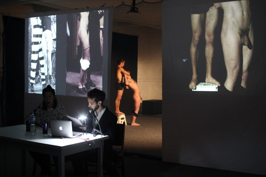 El segundo, es un dispositivo semiótico-instalativo, compuesto por dos pantallas. En una se proyecta una serie de imágenes que forman un conjunto heterogéneo de pinturas renacenstistas, noticias periodísticas o fotogramas de películas, entre otras, que el conferencista comenta. En la segunda pantalla se proyectan las acciones que en directo realizan dos performers grabadas a través de una cámara de circuito cerrado.