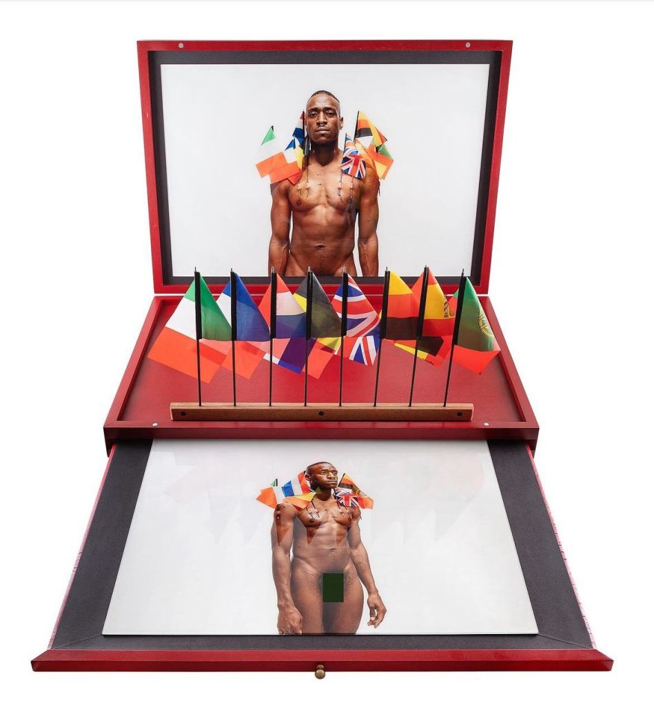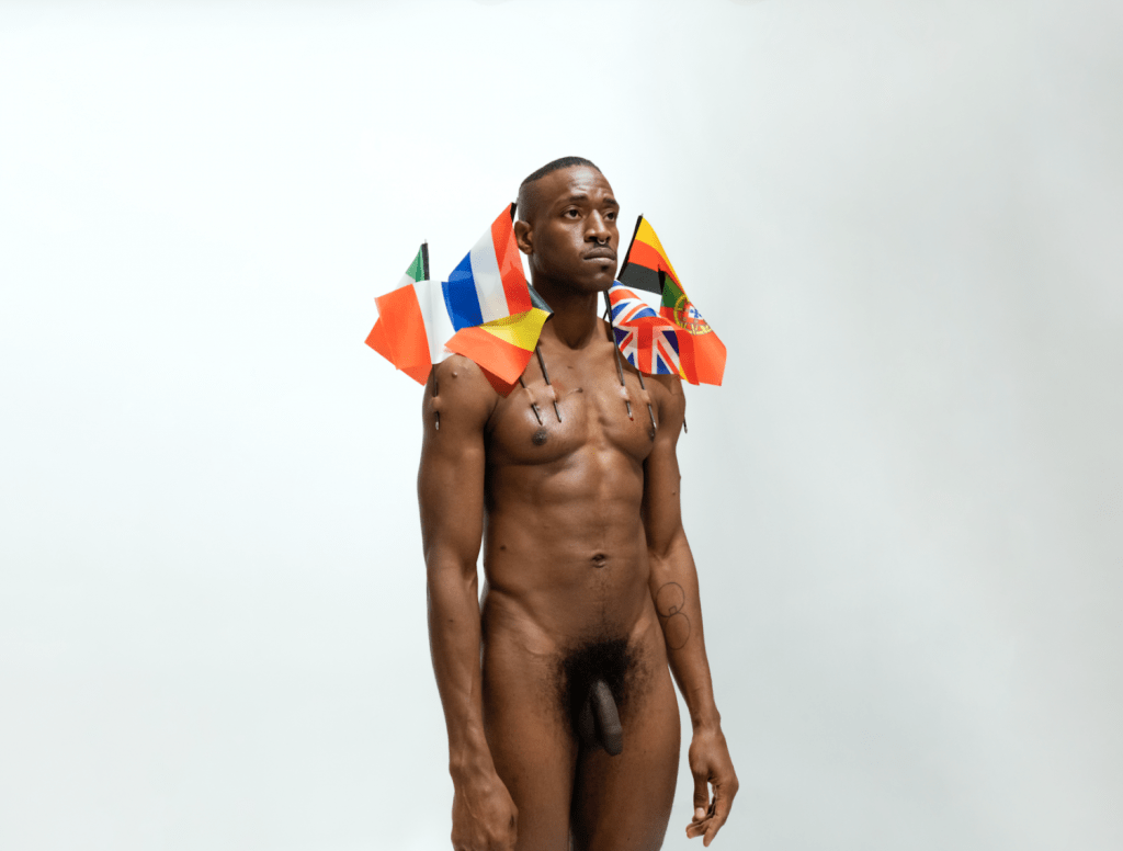 Permanezco de pie en la galería con 8 banderas de mano, clavadas en la piel de mi torso. Las banderas usadas corresponden a los países europeos que invadieron, colonizaron, y dividieron territorialmente África entre la década 1880 y el inicio de la Primera Guerra Mundial: Reino Unido, Alemania, Bélgica, Países Bajos, Italia, Francia, Portugal y España.