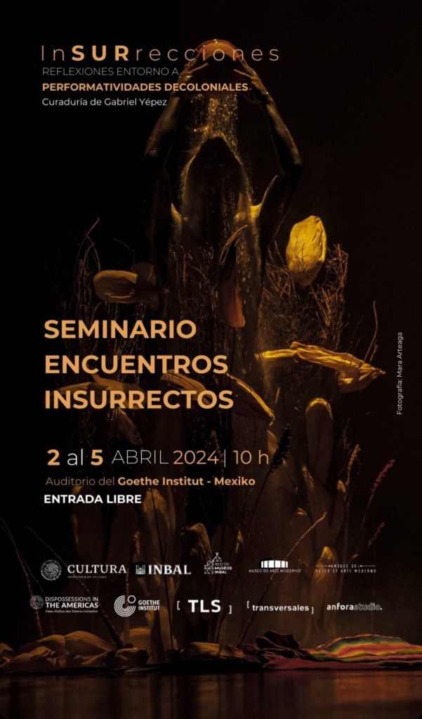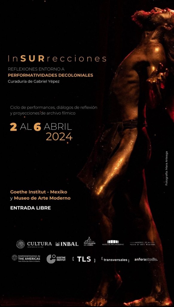 inSURrecciones, reflexiones en torno a performatividades decoloniales, toma inspiración y fuerza de esa voluntad colectiva de nuestro SUR, que desde Alaska hasta la Patagonia, intenta abrir una fisura en la producción artística basada en el modelo neoliberal para reflexionar sobre los procesos creativos que utilizan las prácticas performativas como estrategia para nombrarse y nombrar la otredad desde una perspectiva decolonial.