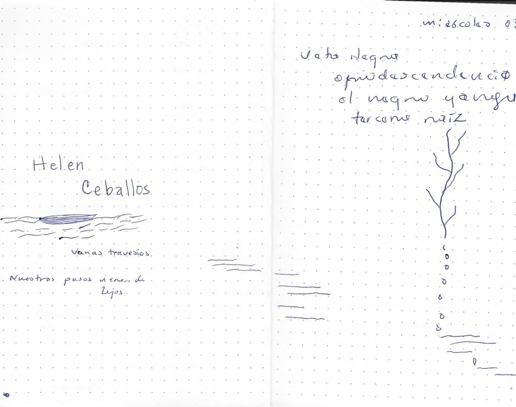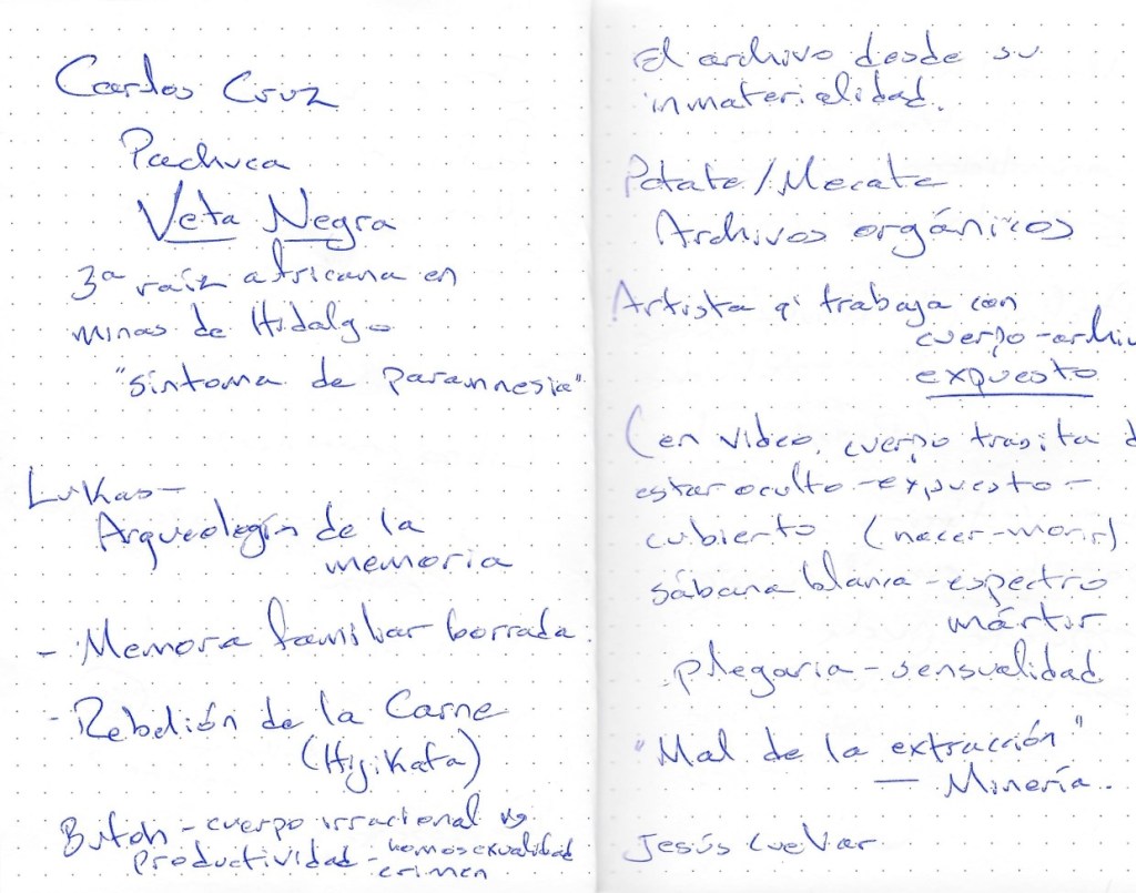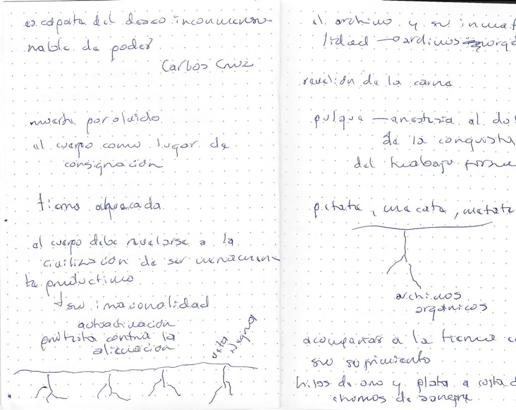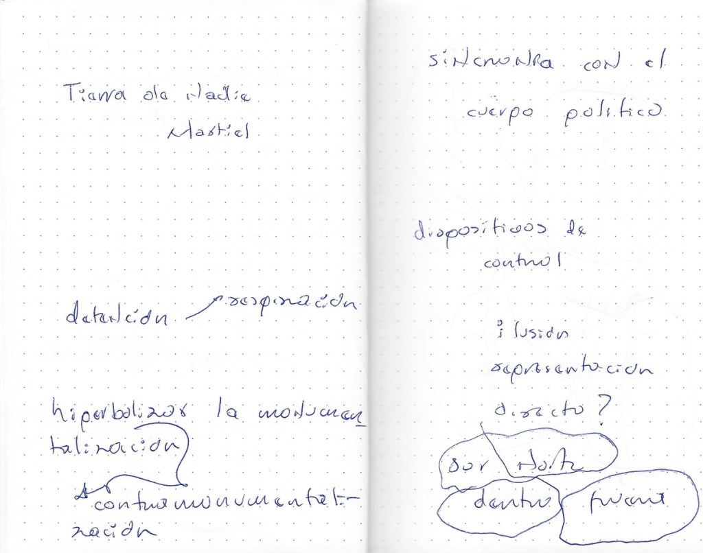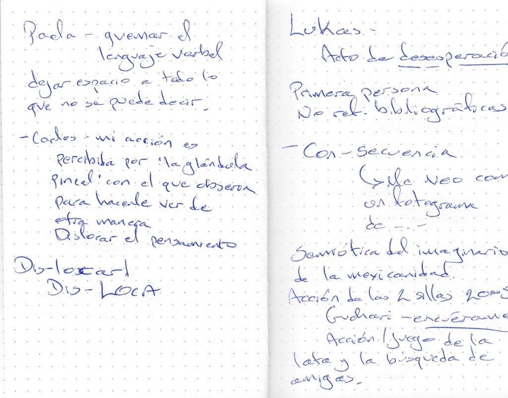 Durante las jornadas reflexivas llevamos a cabo distintas metodologías, entre ellas, las notas migrantes, apuntes realizados por los participantes que día a día se intercambiaban, de manera que el registro también daba cuenta de las diversas perspectivas reflexivas dentro del grupo de teóricos y asistentes al encuentro.